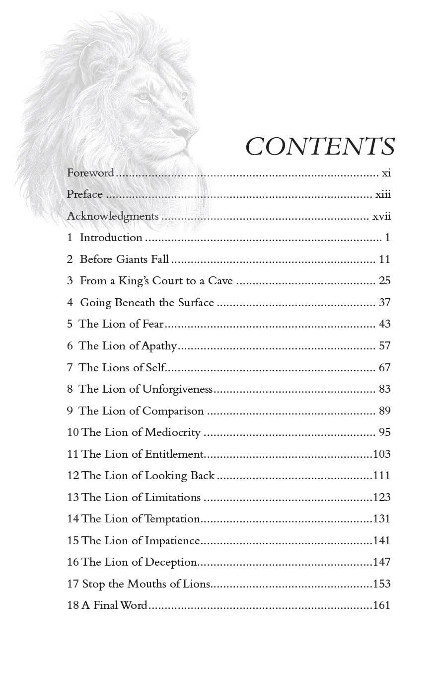While most of us will never engage in such a battle with a physical beast, we must each ask ourselves how to defeat the internal lions that seek to defeat us—lions such as fear, temptation, unforgiveness, apathy, and impatience. If these lions are left unchecked in our lives, they can become threats to our ability to fulfill our destiny. As each battle brings us one step closer to victory, we must decide that our future, our calling, our family, and our ministry are worth the fight. And day by day, as we defeat each lion, we grow closer to achieving the plans God has in store for us.